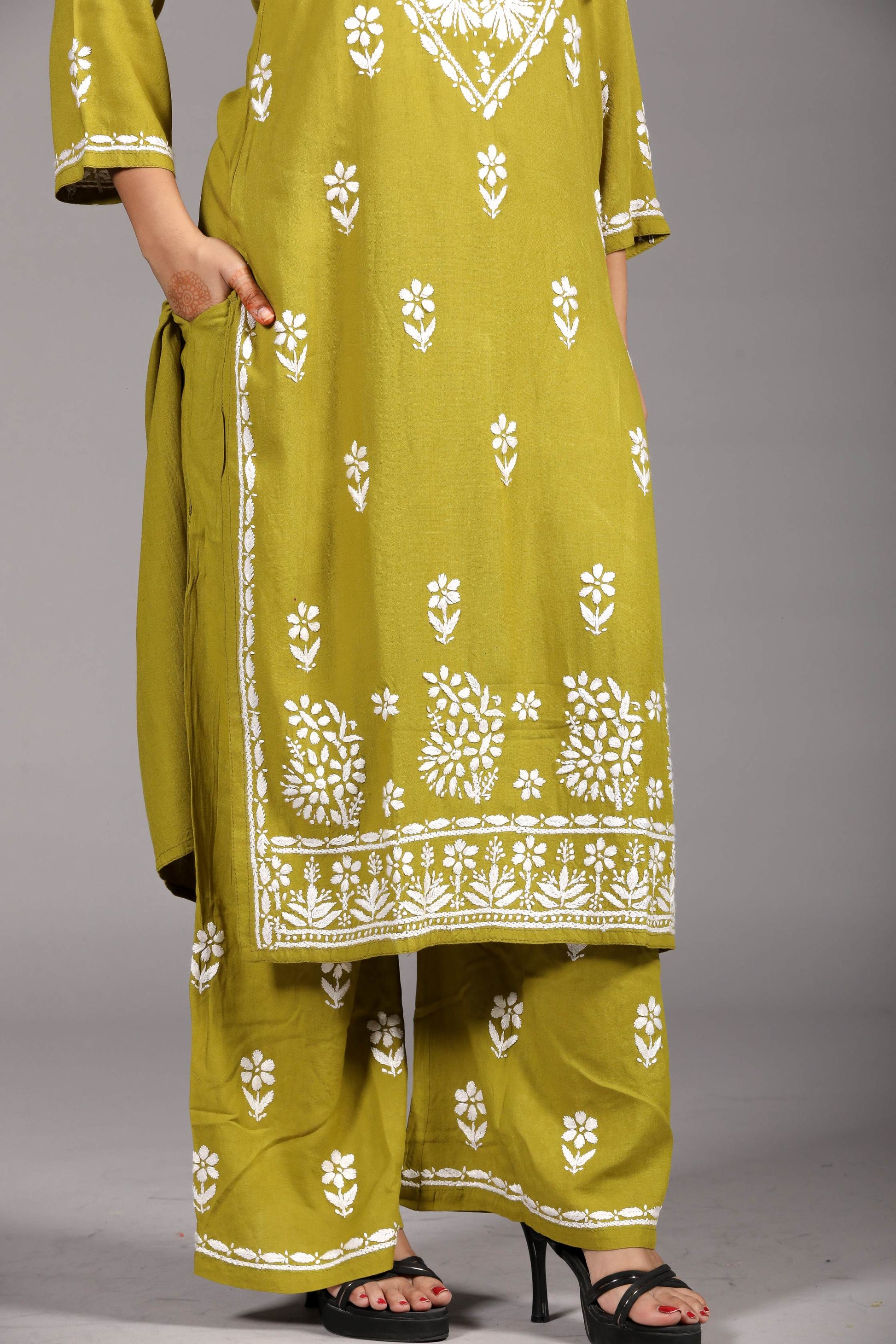 🌿 MYRA Rayon Kurti Palazzo Set – Mehendi Colour