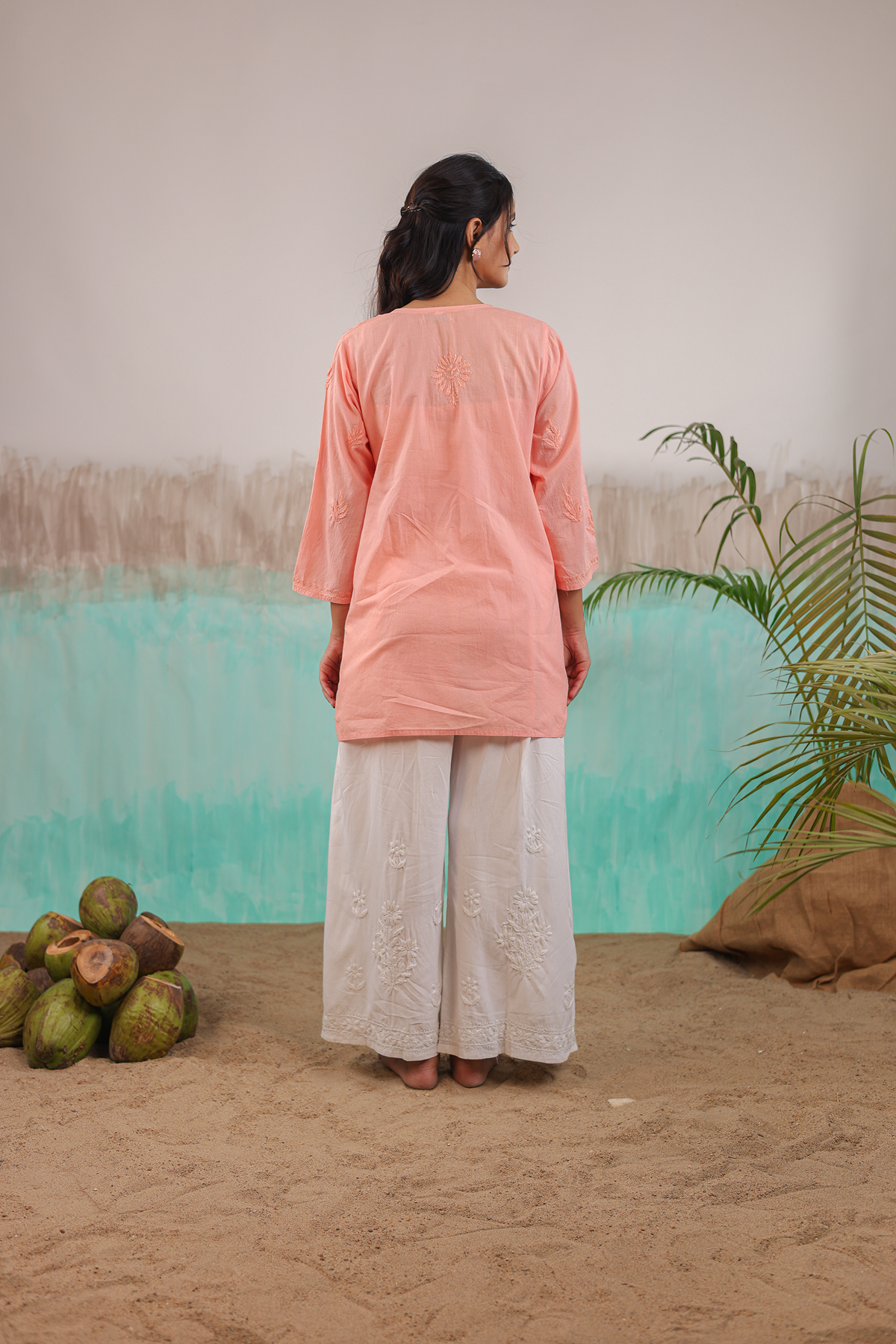NEERA PEACH Handcrafted Chikankari Short Kurti with ghas pati work