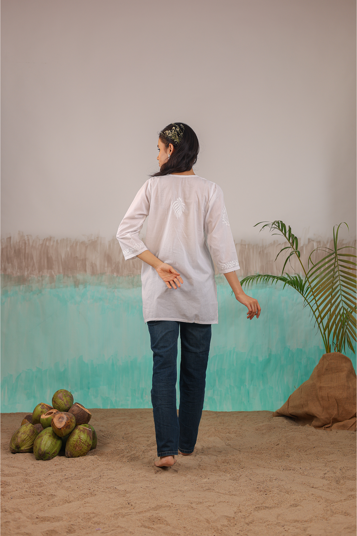 ANAYA WHITE Handcrafted Chikankari Short Kurti with ghas pati work