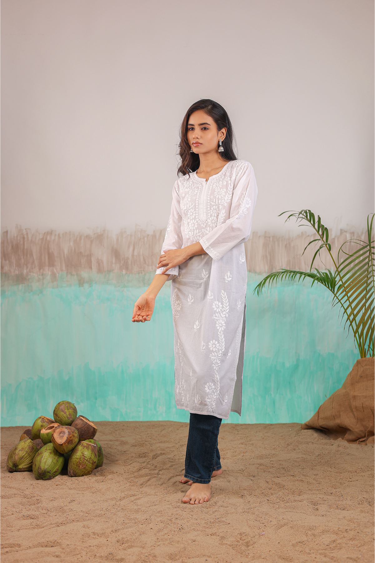 KAVYA WHITE Handcrafted Chikankari Long Kurti with ghas pati work